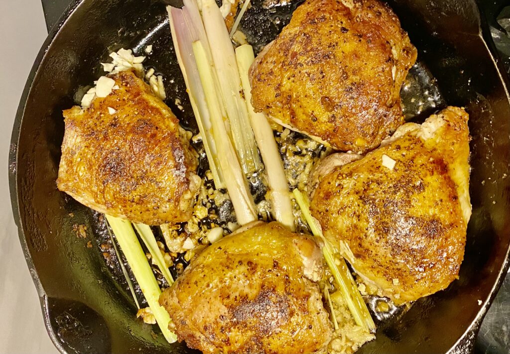 After the skin-side-down cooking, flip the thighs and remove most, but not all, of the fat. Add the chopped garlic and ginger, the lemongrass and lime leaves, and cook over medium heat, uncovered, about 10 minutes. Whether you’re adding coconut milk, Tom Ka Kai paste mixed with water (or both), be careful pour the liquid carefully around, not on top of, the crisped skin. Simmer for another 5 minutes and serve immediately with rice, or place in a 250° oven for up to 15 minutes.Note: Asian cuisines abound with excellent hacks in the form of jarred pastes, sauces and infusions. Tom Ka Kai paste is made with shallots, kaffir lime leaf, galangal, lemon grass, garlic and coconut milk. It’s available on Amazon and at Asian markets.